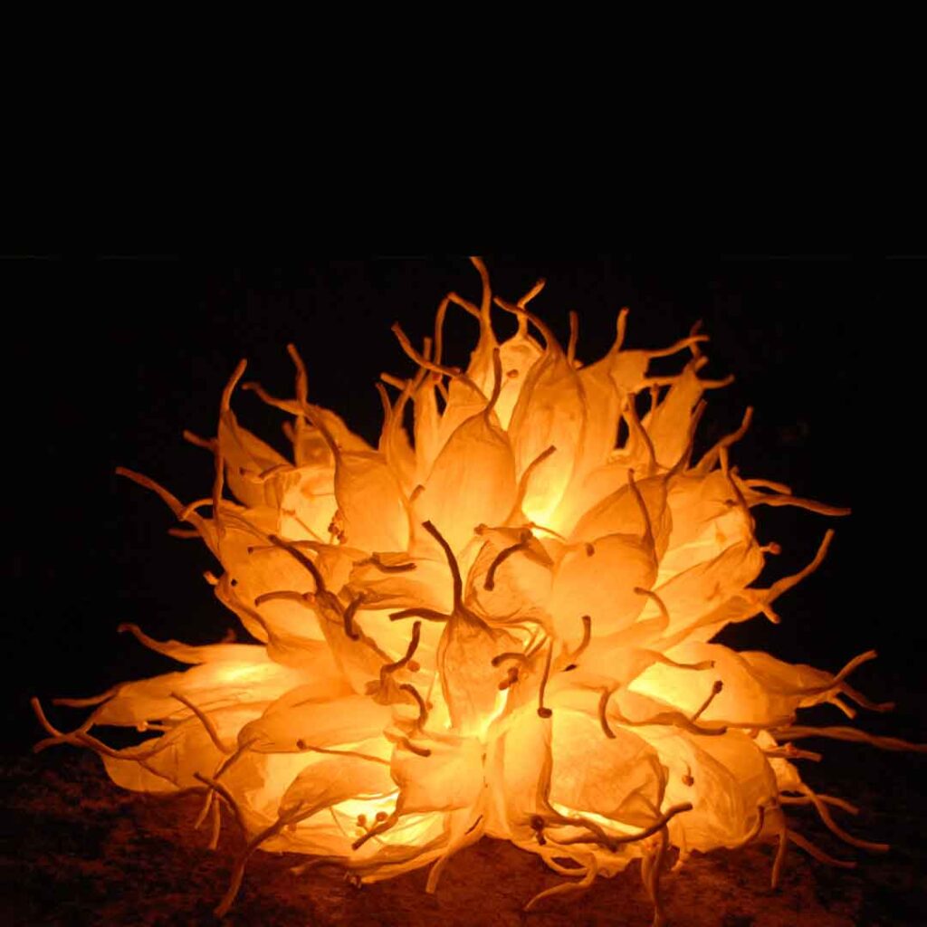 Handgefertigte Blüten-Lichter und Deko-Objekte.