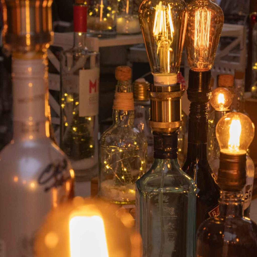 Leuchtende saisonale Dekoflaschen, Flaschenlampen, Schlüsselbrett mit alten Flugzeugsitzgurtschnallen – Alles Handarbeit!