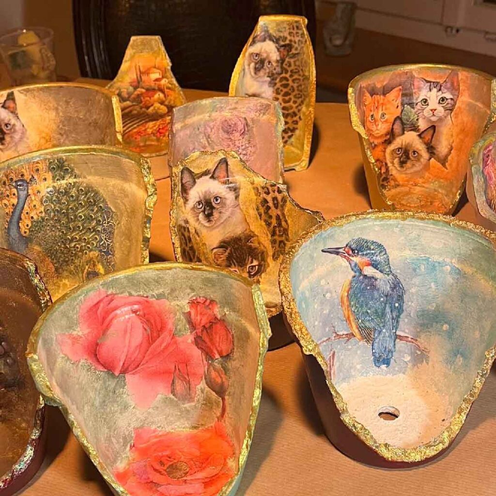 Unikate – Mosaik Lampen und Windlichter in verschieden Farben und Formen. Weihnachtskugeln aus Decoupage und Makramee.